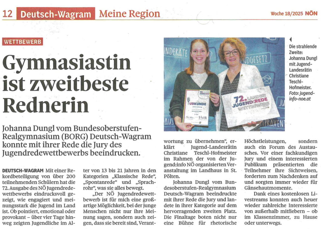 Wir gratulieren unserer Schülerin Johanna Dungl aus der 8b herzlich zum 2. Platz beim NÖ Jugendredewettbewerb. Auch die Niederösterreichischen Nachrichten haben über diesen Erfolg berichtet: