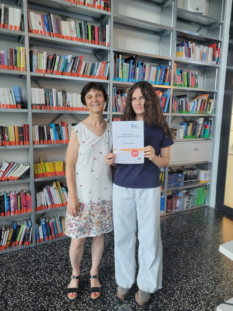 Neuigkeiten aus der Bibliothek Veröffentlicht am 27. Juni 202527. Juni 2025 von BORGDW Priscilla Dascal aus der 7b hat heuer die meisten Bücher aus der Schulbibliothek entlehnt und einen Gutschein der Buchhandlung erhalten. Weiterhin viel Spaß beim Lesen! Mag. Ulrike Hofer