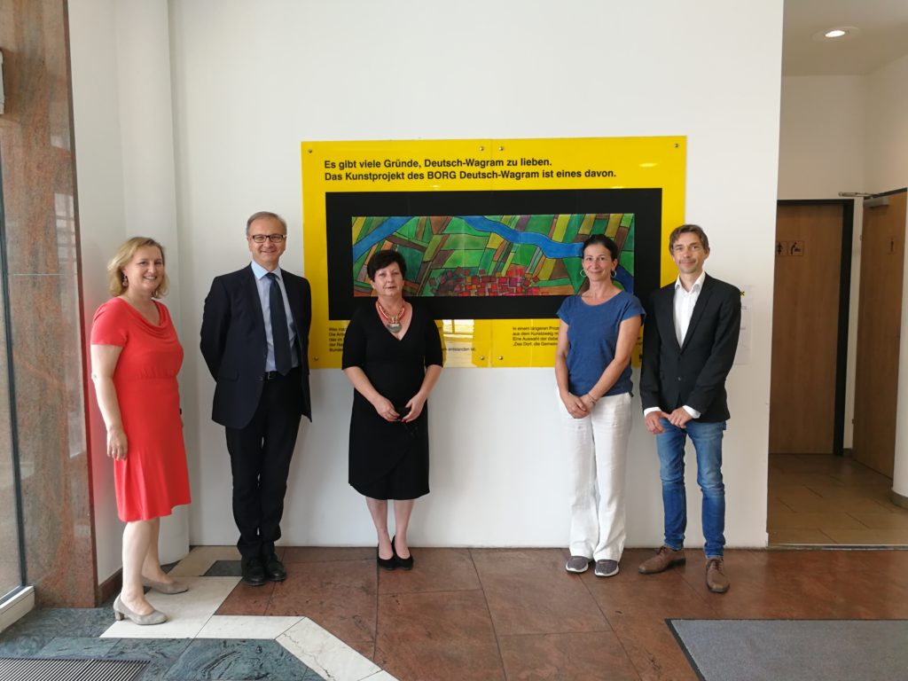 In einem längeren Prozess setzten sich Schülerinnen aus dem Kunstzweig mit unserem Lebensraum auseinander. Aus den fünf Bildern der Schülerinnen Lena Schatzl, Louise Rottl, Büsra Dal und Natalie Votzi entstand ein Gesamtkunstwerk, das den Titel „Das Dorf, die Gemeinschaft umgeben von fruchtbaren Feldern und Natur“ trägt. Zu bewundern gibt es dieses Kunstwerk im Foyer der Raiffeisenbank in Deutsch-Wagram.