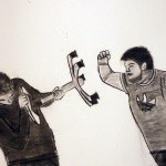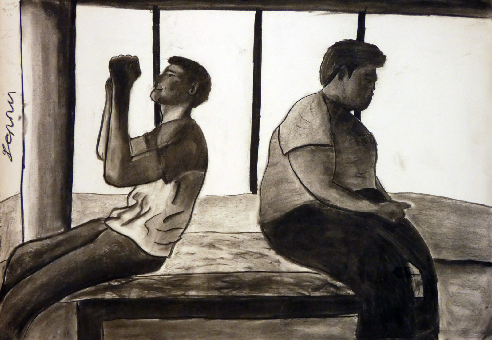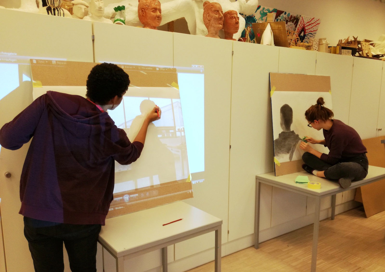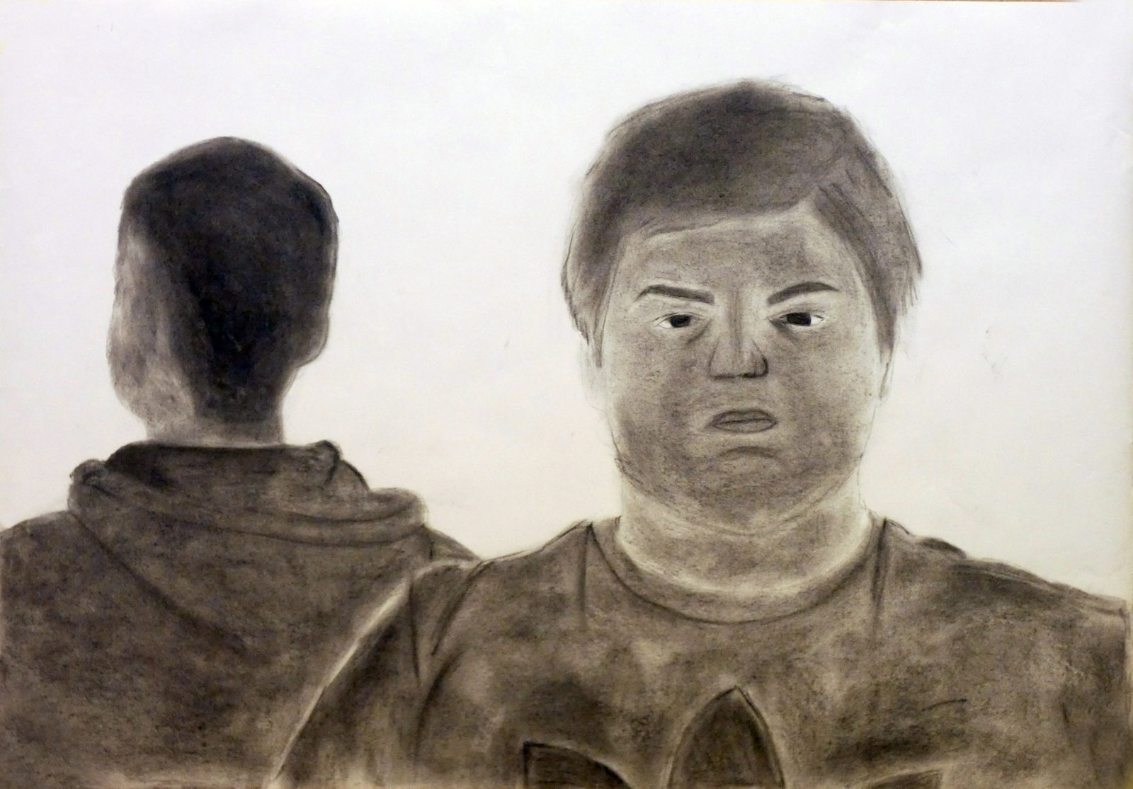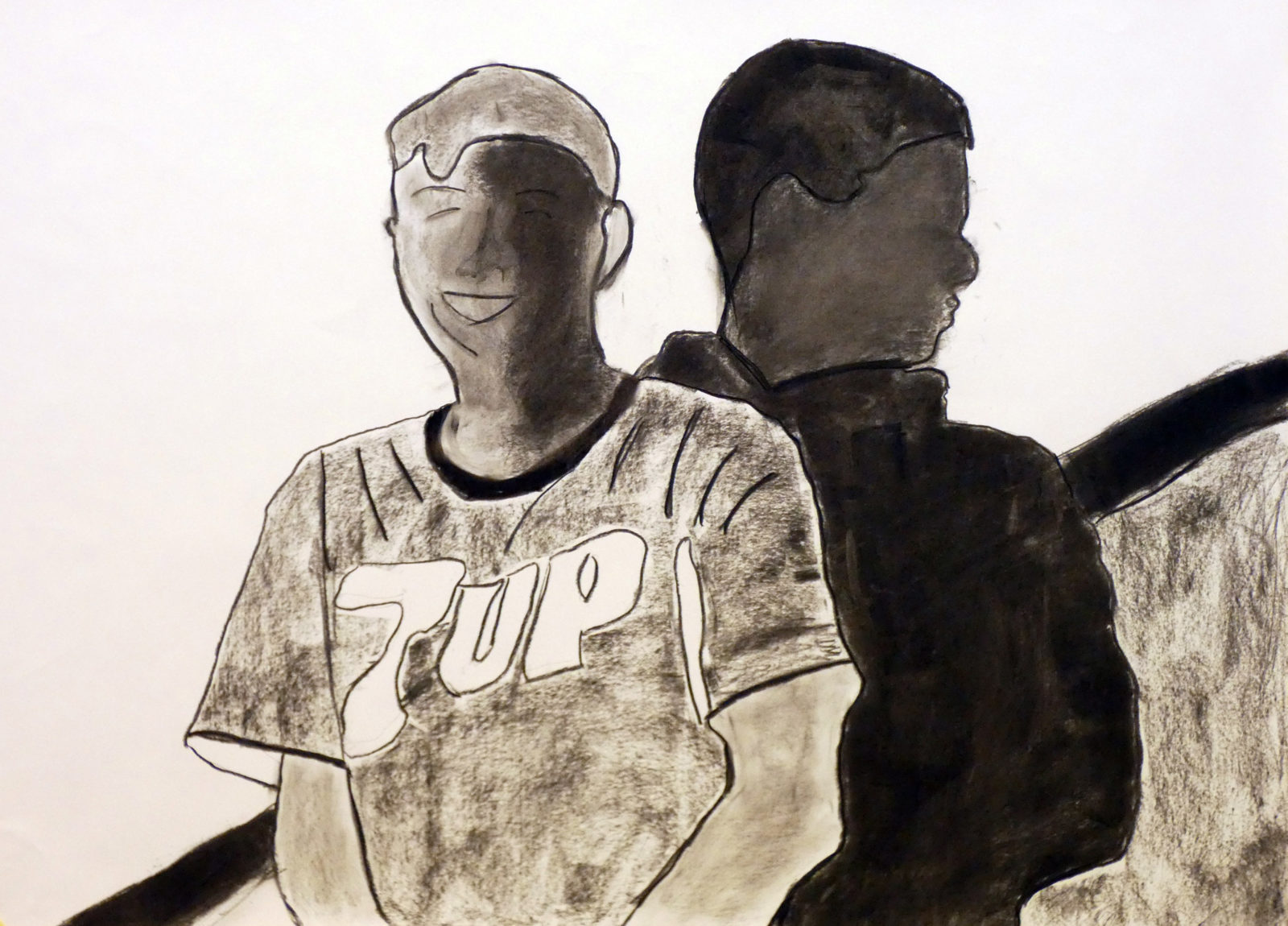 Die Geste und die Körpersprache gelten als eindrucksvollste Kommunikationsmittel. In diesem Projekt der BE-Gruppe der 7b-Klasse von Professor Diman haben die Schülerinnen und Schüler zwischenmenschliche Beziehungen in ihren Arbeiten thematisiert. Insbesondere ist es darum gegangen, zwiespältige Beziehungen zu verbildlichen. Recherchen zu diesem Thema in der Kunstgeschichte waren der Einstieg in die praktische Arbeit. Die erste Aufgabe war es, die inszenierten Fotos zu machen, im Zuge dessen ist die Fotografie als Ausgangspunkt in der zeitgenössischen Malerei und Zeichnung besprochen worden. Anschließend haben die entstandenen Fotos als Vorlage für die großformatigen Kohlezeichnungen gedient. Durch die Übersetzung der Farben und Formen in harte Schwarz-Weiß-Kontraste wird die Dramatik der Motive gesteigert. Dadurch haben die Schülerinnen und Schüler die Expressivität und den Charme dieser Zeichentechnik wiederentdeckt.